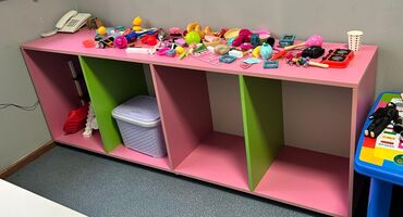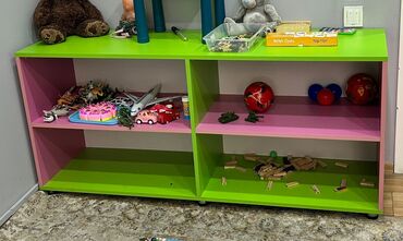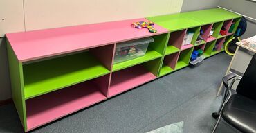 - Rəflər uşaqların əlçatımlı hündürlüyündədir – oyuncaq, kitab, qutu və didaktik materialların səliqəli təşkili üçün