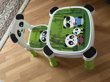 - Dizayn: ağ-yaşıl rənglər, panda fiqurları; masanın və stulun üzərində “Panda” naxışları