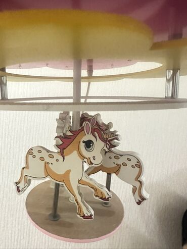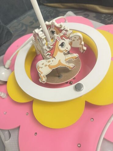 - Dizayn: çiçək formasında çəhrayı-sarı dekorlu, mərkəzdə fırlanan/assılı unicorn fiqurları ilə.