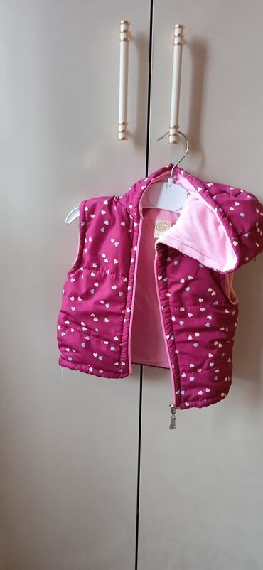 Uşaq üçün kapşonlu yunlaşdırılmış jilet - Rəng: parlaq çəhrayı - Model: kapşonlu, ön hissə düyməli/snaps bağlanma - Material: yüngül şişmə doldurmalı parça, içlik açıq rəngdə - Dizayn detalları: p...