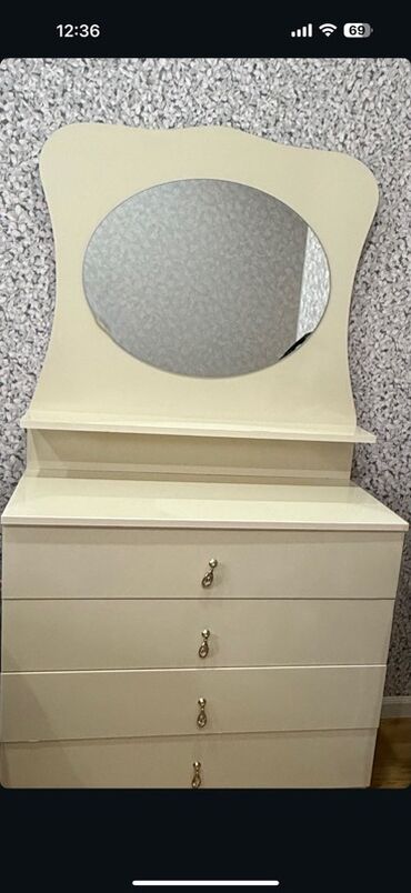 - Güzgülü komod: üstündə dekorativ oval güzgü paneli, aşağıda 4 geniş çekmece.