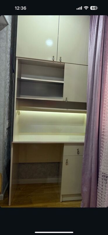 - İş masaı ilə birləşmiş rəfli üst dolab: açıq rəflər, sağda qapalı bölmə, iş səthinin altında LED işıqlandırma.
