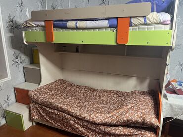 - Alt mərtəbə: tam ölçülü çarpayı, yan tərəfdə narıncı qoruyucu panel.