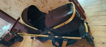 Uşaq arabası – bərk və yüngül alüminium şassi, klassik bej/qızılı rəng kombinasiyası. Xüsusiyyətlər: - Dərin beşik tipli oturacaq: tam yatan vəziyyət, içlik/yastıq dəsti və ayaq örtüsü görünür. - ...