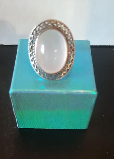 - Material: Korpus gümüş rəngdə metallıdır. Mərkəzdə parlaq, şəffaf-ağ tonlarda oval kaboxon tipli daş yerləşir.