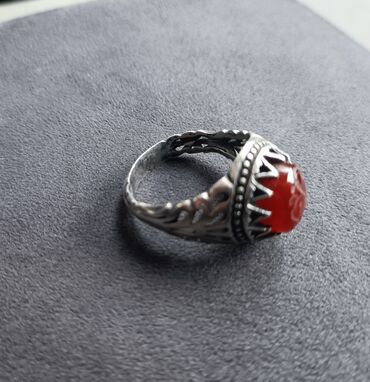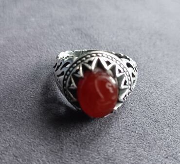 Tebii gırmızı əqiq daşı ilə bəzədilmiş, gümüş 925prob ,səbəkə naxışlı üzük. Ətrafı kiçik daşlarla əhatələnib. Zərif və eleqant görünüşə malikdir.