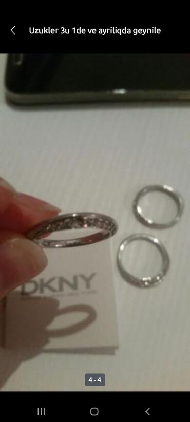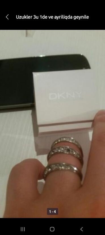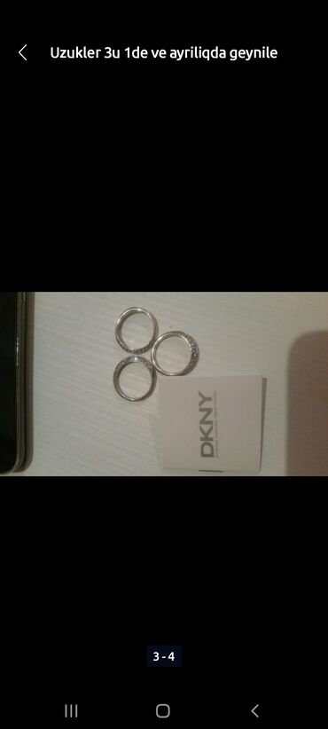 Uzukler 3u 1de ve ayriliqda geynile biler. Oriqinal DKNY. polad. Uzuyun qravirovkasindada dkny yazilib. Qashlar qornii xrustal . 3 qashi dushub. Drezdende(Almaniya) alinib