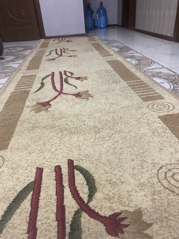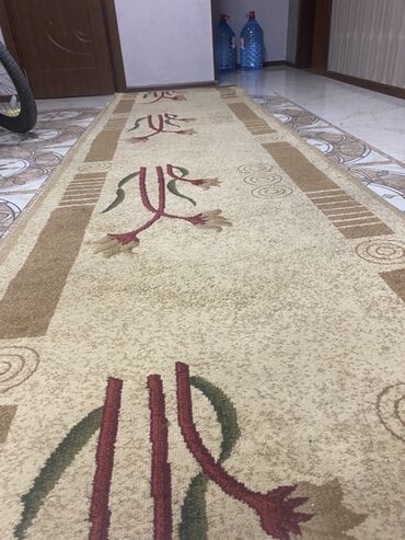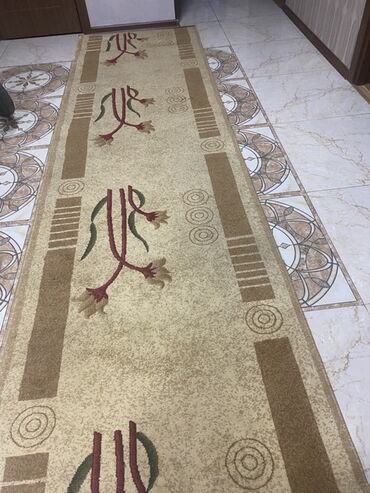 Uzun dəhliz xalçası uzunluq 3m eni 1m - Rənglər: bej fon, qəhvəyi haşiyələr, qırmızı və yaşıl naxışlar - Dizayn: ortada uzun qırmızı saplara bağlı stilizə edilmiş çiçək motivləri, kənarlarda zolaq...