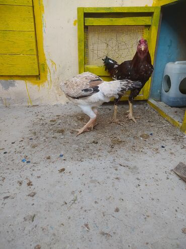 Məhsul: Yerli toyuq-quş dəsti Təsvir: - Şəkillərdə uzunboylu, əzələli gövdəli bir xoruz və yanında bir toyuq görünür. Xoruz çoxrəngli lələklərə malikdir: qara əsas fon üzərində ağ, krem və pas ton...