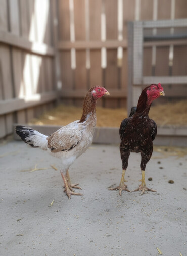Məhsul: Uzunboyun, döyüş tipli toyuq cinsi (asan tanınan “Naked Neck/Turka” xüsusiyyətli xoruz və eyni tipli cavan toyuq) Təsvir: - Şəkillərdə biri ağ-qara ləkəli, qırmızı boyunlu, uzun ayaqlı xor...