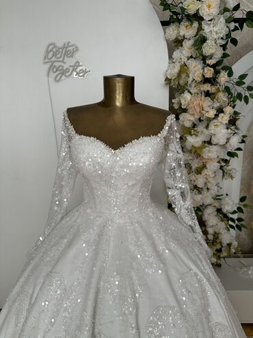 Bəyaz bal zalı gəlinlik - Siluet: klassik balıq-quyruqsuz, geniş ətəkli “ball gown” - Atlas/parıldayan tül qatları üzərində sıx payet və muncuq işləmələri - Bədən hissəsi “sweetheart” dekolte, çiy...