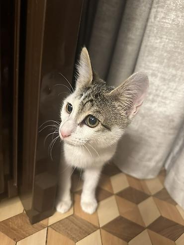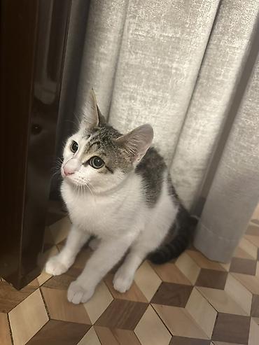 Şirin balaca pişik balası - Cins: Ev pişiyi (qısa/orta tüklü) - Rəng: Qızılı-boz tabby (zolaqlı), balaca “ayaqqabı”lı ağ-boz pəncələr - Gözlər: Mavi-boz tonlarında - Xüsusiyyətlər: Yumşaq, sıx tük...
