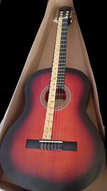 akustik gitara – qırmızı-siyah sunburst rəng keçidi ilə. (Iphone Modeli Ile Barter Var) Xüsusiyyətlər: - 6 simli klassik quruluş - Dairəvi rezonans oyuğu, dekorativ rozetka naxışı - Taxta klavatura...