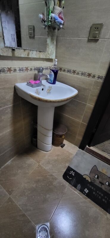 - Keramik lavabosu (piyedestallı) – dekorativ çiçək naxışlı, geniş kənarlı, tək qollu qarışdırıcı kran ilə.