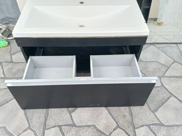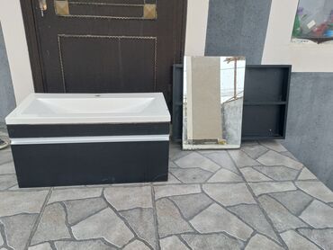 Hamam üçün komplekt mebel və aksesuarlar - Asma hamam dolabı: 2 geniş çekmecəli, ağ rəng. Üstündə inteqrə keramika lavabo. - Qarışdırıcı kran: tək tutacaqlı, lavaboya quraşdırılmış. - Güzgü: iri ö...