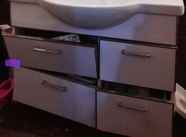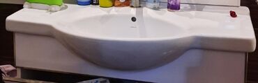 - Üst hissə: geniş keramik lavabo, ortada tək kran üçün yer, daşırma dəliyi. Kənarlar qoymaq üçün geniş səthlidir.