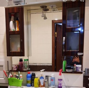 - Üst hissə: iri güzgü paneli və güzgünün hər iki yanında qapılı asma şkaflar; qapılarda mat şüşə panellər və metal tutacaqlar.