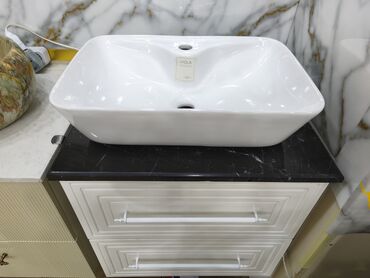 - Üstə quraşdırılan keramik lavabo (VIOLA), oval-düzbucaqlı forma, hamar parlaq səth, mərkəzdə su çıxışı.