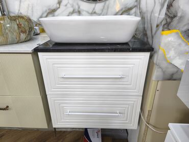 Hamam üçün divara montaj olunan lavabo və şkaf dəsti - Material: cilalanmış daş/daş-kompozit üst hissə, monolit kvadrat formalı qab; aşağıda laklı ağ MDF çekmecəli modullu şkaf - Rəng və dizayn: a...