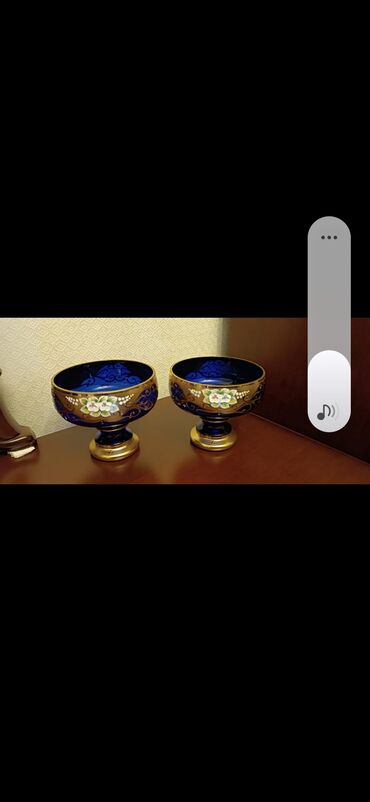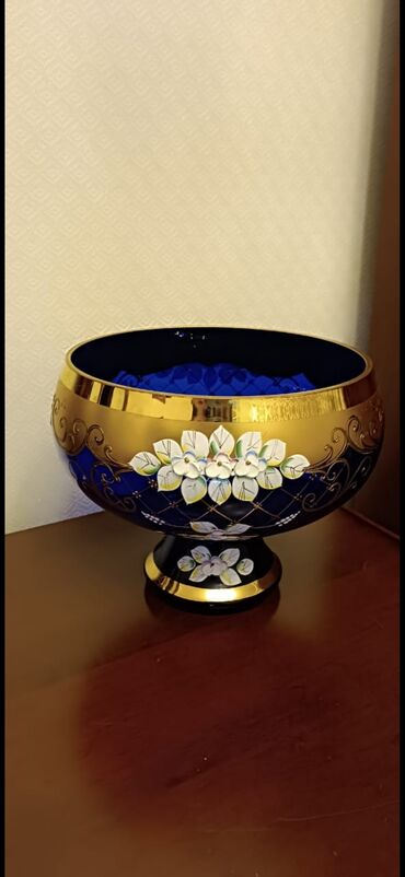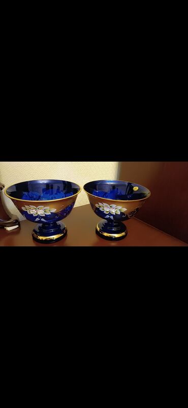 Boyalı büllur dekor dəsti - Tərkib: 1 ədəd iri vaza və 2 ədəd ayaqlı meyvə/göyərti qabı (kompotnik). - Material: qalın büllur/şüşə. - Rəng: dərin kobalt-mavi əsas, qızılı zərli işləmələr. - Dekor:...