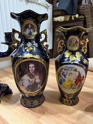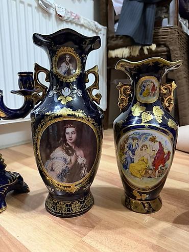 Porcelan vazalar dəsti - Rəng: tünd lacivərd əsas, qızılı naxışlarla - Dizayn: üzərində üzüm yarpağı və salxım motivləri, ön və boğaz hissələrində portret rəsmləri - Material: parlaq şirli (glazur...