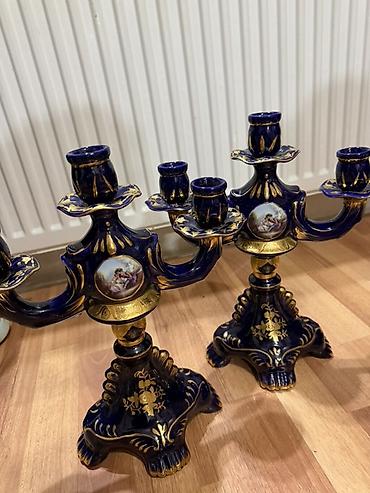 - 2 ədəd 3 şamlı şamdan: kobalt-mavi fon üzərində qızılı detallarla zəngin bəzək, orta hissədə dairəvi miniatür səhnə təsviri. Geniş dayaqlı baza, relyef elementlər və qızılı vurğular kompozisiyanı tamamlayır.