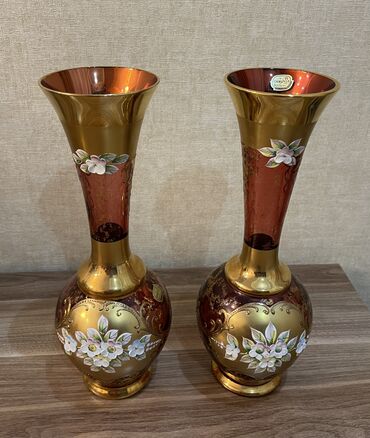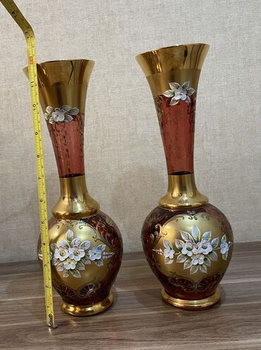 Bogem şüşəsindən hazırlanmış, qızılı rəngli, çiçək naxışlı vaza.Sovet vaxtı alınıb. Geniş ağızlı və möhkəm oturacaqlı bu vaza, ev dekorasiyası üçün uyğundur.hündürlüyü 26sm, diametri 10sm. Üzərində...