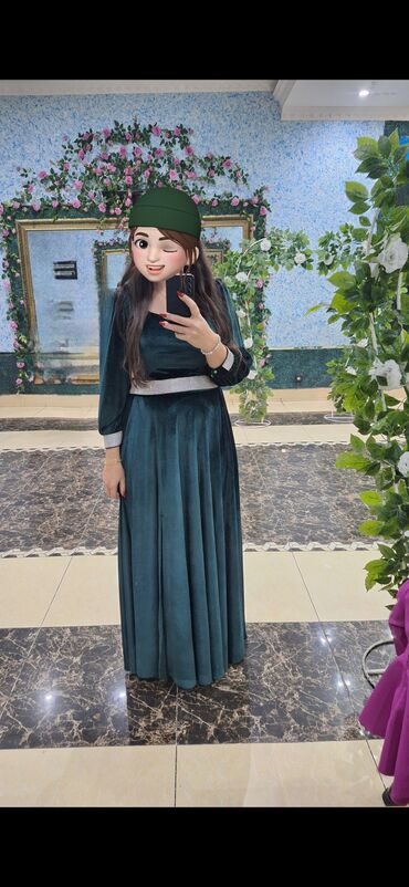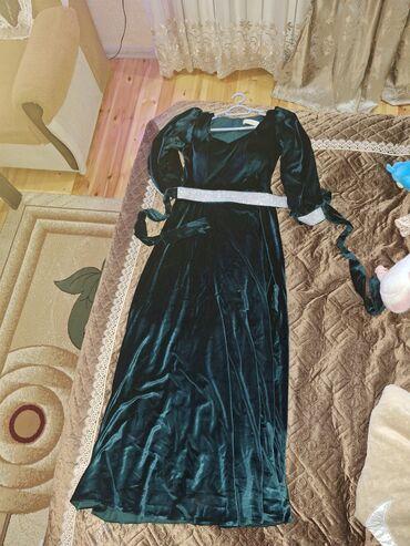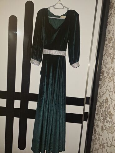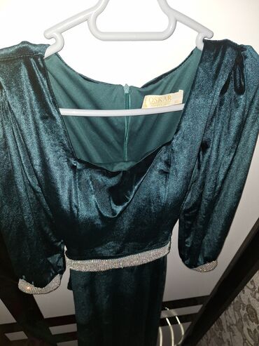Brend: Ay İs Li Bədən ölçüsü: 50 Tünd yaşıl rəngdə, uzun ziyafət/abiyə don. - Yarı dairəvi (crew) yaxa - 3/4 qol - Etek hissəsi uzundur, axıcı kəsim - Qol və bel hissəsində muncuq/daş ap...