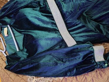 Zümrüd-yaşıl rəngdə, parıltılı toxumalı ziyafət/libas. - Marka: Lüks Moda (Fransa) - Model: qolu şifon, yarı şəffaf və daşlarla bəzədilmiş - Yaxa: V-kəsim, kəsişən (wrap) ön hissə, büzmə effektli -...