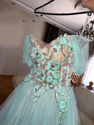 - Üç ədəd qadın paltarı dəsti. 1) Ağ, zərif gəlinlik tərzində uzun paltar: - Üst hissə atlas tor üzərində güllü aplikasiya və incə daş-saçaq detalları ilə. - Uzun şifon ətək, yüngül axıcılıq. - Uz...