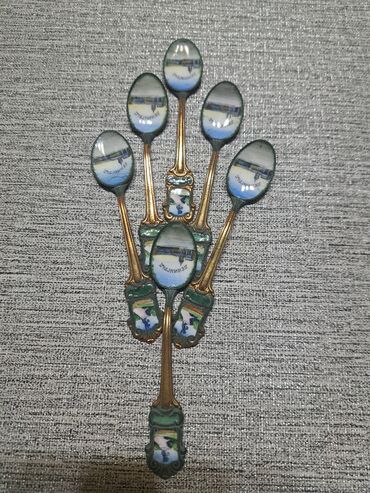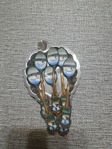 Moskva temalı suvenir çay qaşıqları dəsti - Sayı: 6 ədəd - Material: qızılı rəngli metal ərintisi - Dizayn: Hər qaşığın ləçək formalı oval kasasında Moskvanın memarlıq mənzərəsi olan rəngli emal t...