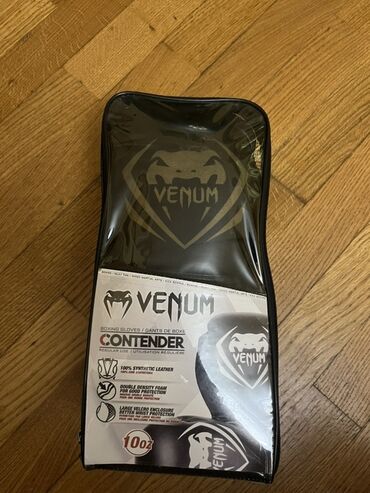 Qutu/çanta üzərində “Boxing Gloves – Contender – Regular Use – Technical Specifications” məlumatları mövcuddur. Venum brendinin rəsmi dizaynı və loqotipləri.