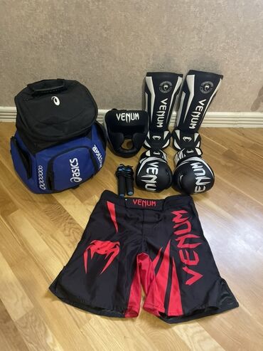 MMA/Boks üçün tam qoruyucu və məşq dəsti Brendlər: Venum, Reebok, UFC, Adidas, HRT Dəst tərkibi: - Venum boks əlcəkləri (qara, Velcro bağlama, qalın yumşaq dolğu, bilək dəstəyi) - Venum baş qoruy...