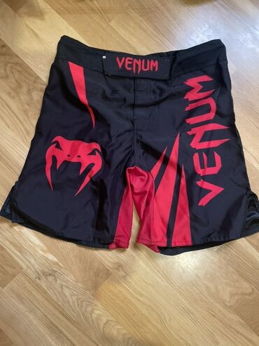 - Venum qısa şort – qara/qırmızı, yan yarıqlı kəsim, ön hissədə “VENUM” yazısı