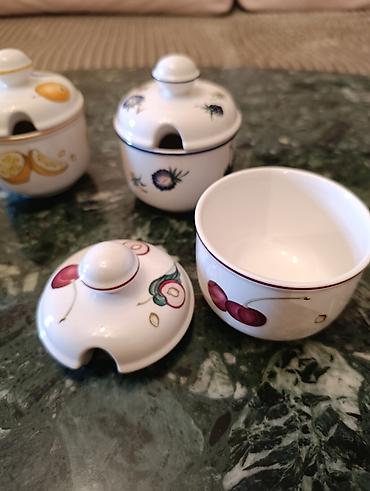 Zərif dekorativ süfrə dəsti - Tərkib: 3 hissə - 1 ədəd ayaqlı iri meyvə/qənnadı qabı - 2 ədəd düzbucaq formalı servis sini (tray) - Rəng və dizayn: İvory (açıq krem) fon üzərində qızıl və qara...