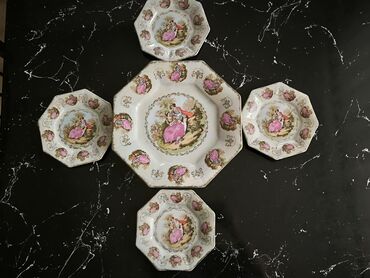 - Dəst tərkibi: 1 böyük səhmə/servis boşqabı + 4 ədəd kiçik boşqab (cəmi 5 parça)