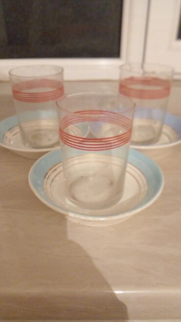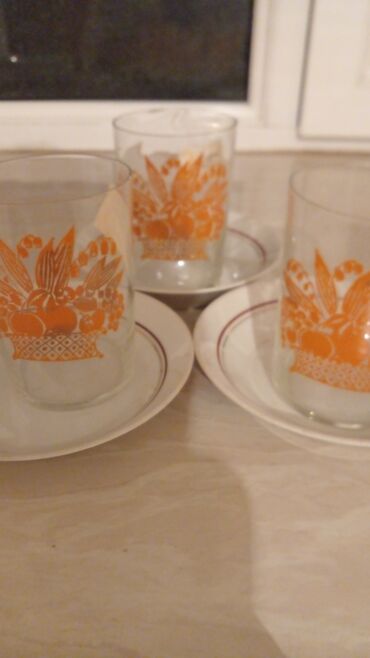Məhsul: Şüşə stəkan dəstləri (SSRİ istehsalı, etiketli) 6 stekan 6 nelbeki teze Təsvir: - Klassik silindrik şüşə stəkanlar, iki fərqli dizayn: 1) Narıncı rəngli meyvə səbəti naxışlı. 2) Qırmız...Giriş•Qeydiyyat
