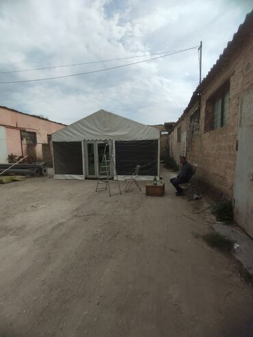 18×6 metr ölçüdə xeyir-şər çadırı - Genişlik: 6 m, Uzunluq: 18 m - Metal boru karkaslı konstruksiya - Üst və yan örtüklər: ağ rəngdə parça/tent materialı - Ön-yan pərdə hissələri yuxarı yığılır, a...