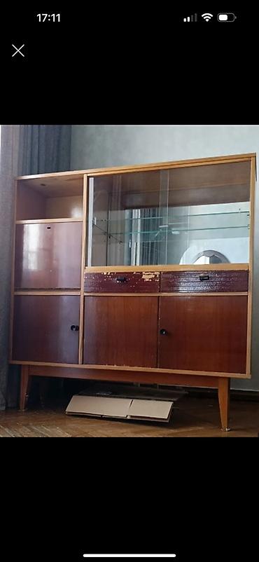 Taxta və şüşə elementlərdən hazırlanmış, tünd qəhvəyi rəngdə vitrin dolabı. Üst hissədə sürüşmə şüşə qapıları olan geniş bölmə, altında isə iki kiçik siyirtmə mövcuddur. Sol tərəfdə iki açıq rəf və bir qapılı bölmə yerləşir. Alt hissədə iki qapılı bölmə var. Dolab dörd ayaq üzərində dayanır və müxtəlif əşyaların saxlanması üçün uyğundur.
