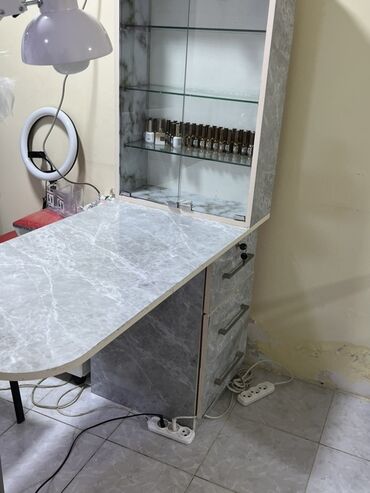 - Mərmər naxışlı geniş iş səthi – dırnaq qulluq və dizaynı üçün rahat ölçü