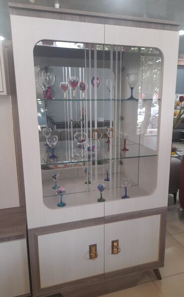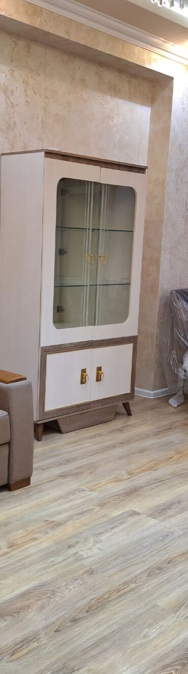 Şırnaq vitrin şkaf 2 ədədi 150 AZN-dir.Sadece dekor olaraq evde qalib istifade olunmayib - Klassik üslubda, krem rəngli vitrin - Ön hissə: iki ədəd şəffaf şüşə qapı, dekorativ qızılı naxışlar və y...