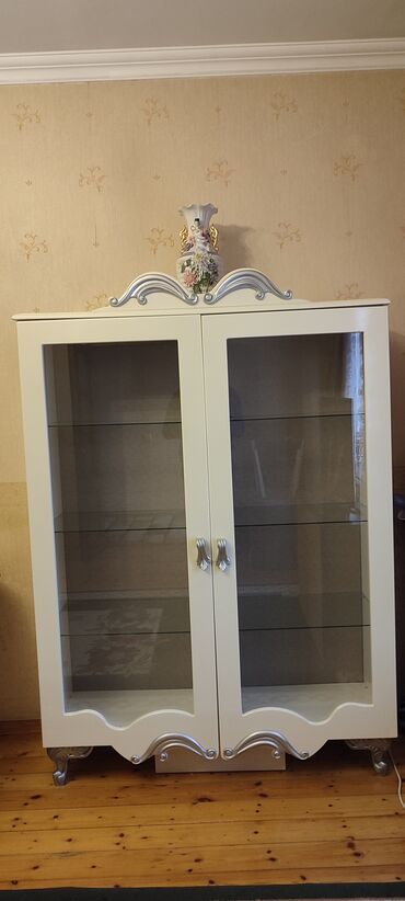 Klassik üslubda vitrin/dolap təzədi 2 ədəd var - Rəng: krem-ağ, qızılı dekor elementləri ilə - Material: MDF/taxta karkas, şüşə vitrin qapıları - Dizayn: üst hissədə oymalı qızılı tac, ön hissədə ...