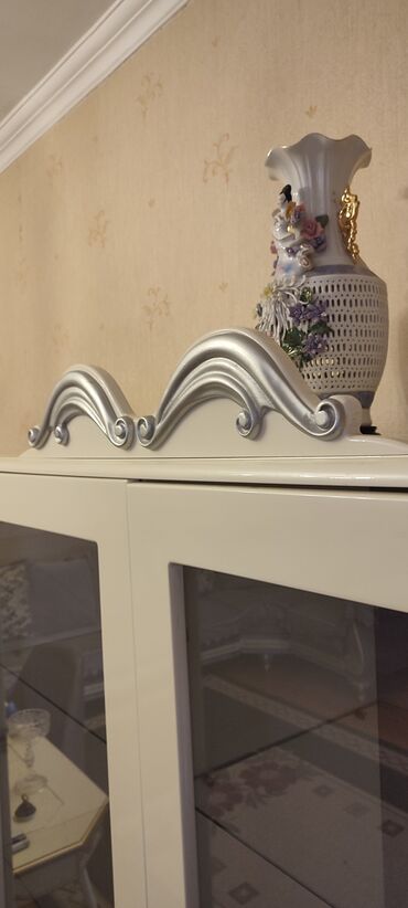 Vitrin şkaf və Güzgülü kamot – klassik dizayn Qiymet - 750 azn - Material: ağ və tünd qəhvəyi rəngdə MDF/taxta konstruksiya, şüşə ön və yan panellər - Üslub: klassik/neo‑barok elementlər; oyma d...
