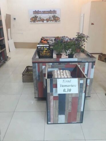 İşlənmişVitrinlər təzə kimidir, yəni çox az 2-3 ay və səliqəli istifadə olunub. 12 predmetdir. Onlardan 10 predmet vitrin+masa və 2 ədəd "Kənd məhsulları" qeyd olunmuş yazıdır ki, biri dükanın daxili üçün digəri hissə mağazanın çöl hissəsini vurmaq üçündür. Şəkildə solğun güşüb, çox yaxşı və rəngli materialdan yığılıbdır.