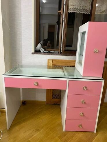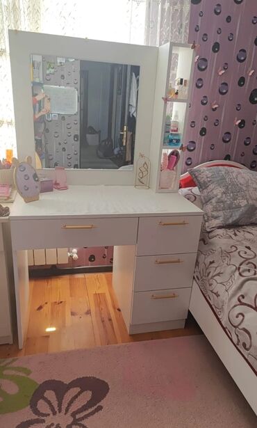 Güzgülü makiyaj/komod masası - Material: ağac teksturalı laminat səth, asan təmizlənən. - Böyük dikdörtqan güzgü, küncləri kəsik dizaynlı – gündəlik bəzək və saç üçün rahat baxış verir. - Sol tərə...