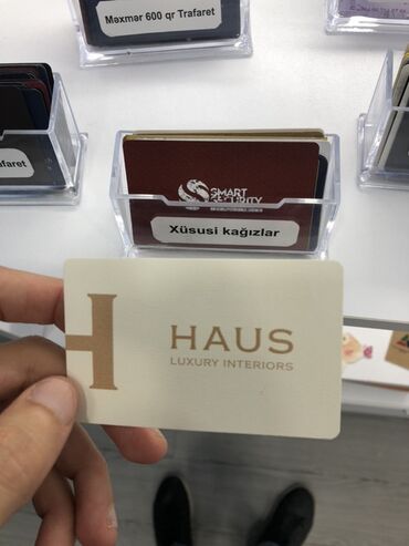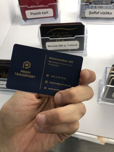 - Stend etiketlərində göstərilən “Ofset 350 qr”, “Məxmər 600 qr Trafaret”, “Şəffaf vizitka”, “Plastik kart”, “Xüsusi kağızlar” kimi seçimlər mövcuddur.