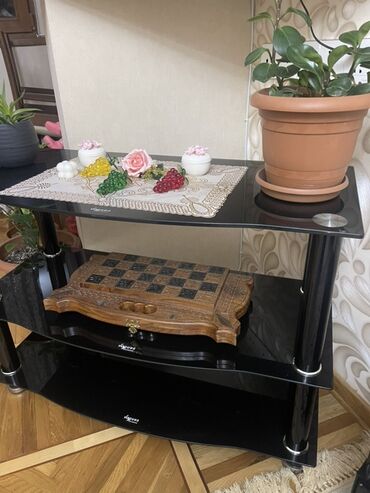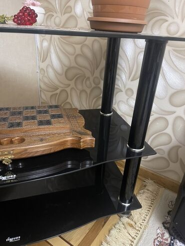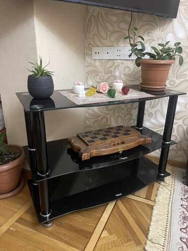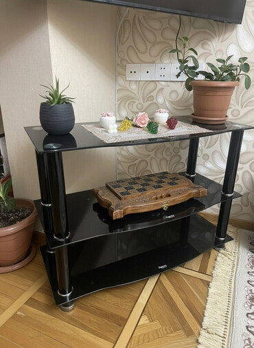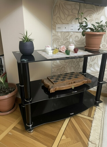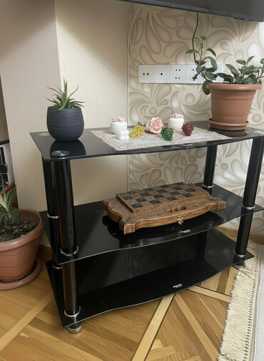 - Dizayn: 3 mərtəbəli, parlaq qara temperli şüşə rəflər
