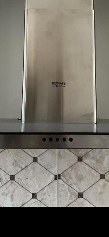 Mətbəx üçün paslanmayan poladdan divar tipli havalandırma/aspirator. Xüsusiyyətlər: - Brend: Bompani (loqo üzərində görünür) - Material: paslanmayan polad korpus, şüşə ön panel - İdarəetmə: ön his...