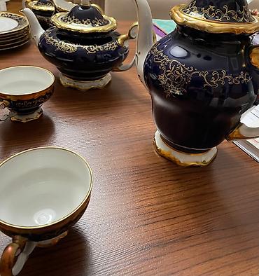 TƏCİLİ SATILIR- Qədimi “Простушка” adlı gözəl və keyfiyyətli Çay dəsti. İstehsal: Polşa. Tərkibi: 1 ədəd dəm çayniki, 6 ədəd fincan ilə nəlbəki, süt qabı, şəkər qabı. Təmiz farfordan. Qəti isti...