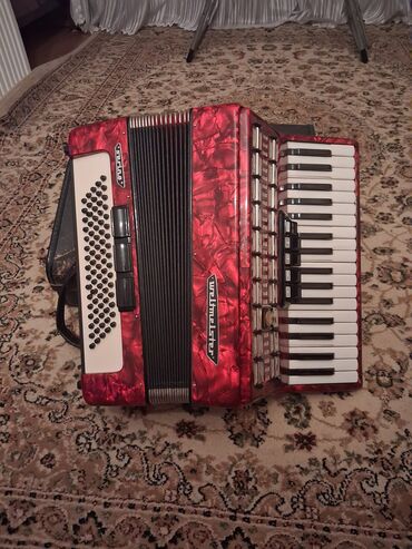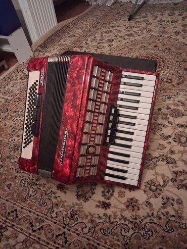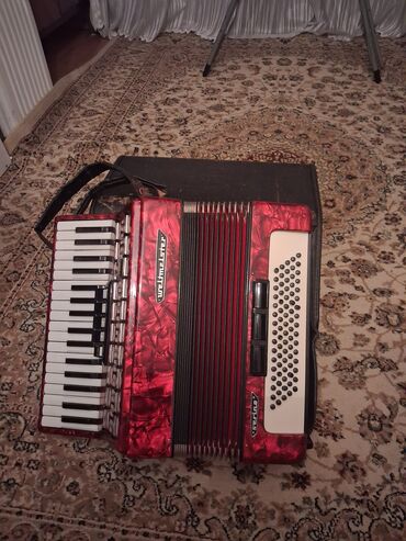 Akkordeon – klavişli və bas düyməli - Tip: Klavişli akkordeon (piano klaviaturası) və sağ tərəfdə bas/akord düymələri - Korpus: Qəhvəyi-mərmər fakturalı örtük, metal yan qapaqlar, klassik keçə kör...